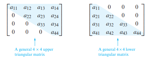 - 주대각선 아래의 모든 원소가 0인 정방행렬을 상삼각행렬(upper triangular)이라 하고, 주대각선 위쪽의 모든 원소가 0인 정방행렬을 하삼각행렬(lower triangular)이라고 합니다.