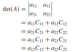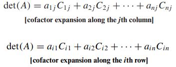 - n x n 행렬 A의 어떤 행 또는 열을 선택하는가와 상관없이, 선택된 행 또는 열에 있는 각 원소와 대응하는 여인수의 곱을 모두 더하여 얻은 수는 항상 같습니다. 이 결과는 다음의 정의를 만듭니다. (즉, 이 결과 자체가 행렬식 값이 됩니다.)