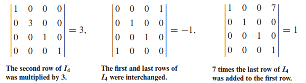 - E가 I의 한 행의 상수배를 다른 행에 더하여 얻은 기본 행렬이라면 det(E) = 1