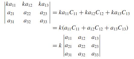 - B가 A의 한 행 또는 열에 스칼라 k를 곱해서 얻은 행렬이라면, det(B) = kdet(A)입니다.