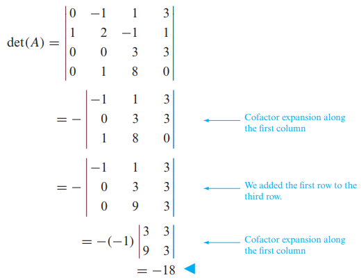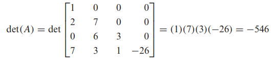 - 기본 행연산을 이용하여 A를 행사다리꼴로 줄여서 계산할 수 도 있지만, 제 1열에 -3배를 제4열에 더하는 작업을 하면 A를 하삼각행렬로 바꿔 빠르게 연산할 수 있습니다. (det(A) = det(A^T) 이기 때문에 이렇게 연산해도 동일하게 적용됩니다.)