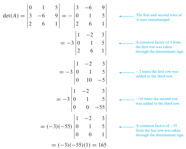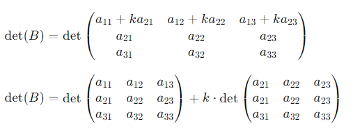 - B가 A의 한 행(또는 열)의 상수 배를 다른 행(또는 열)에 더해서 얻은 행렬이라면 det(B)=det(A)입니다.