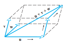 - 벡터 u + v + w를 만드는 간단한 방법은 종점에 시점을 잇대어 연속적으로 벡터들을 나열하고 u의 시점으로부터 w의 정점을 잇는 벡터를 그리면 됩니다.