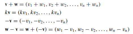 - v = (v1, v2,..., vn) , w = (w1, w2,..., wn)에 대해 v1=w1, v2=w2, ... , vn=wn이면 v와 w는 동등하다(또는 같다)고 하고 v=w로 표시합니다.