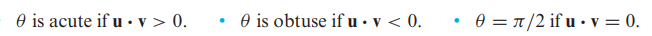 - 따라서 다음과 같이 내적의 부호에 따라 θ가 예각인지 둔각인지 직각인지 알 수 있습니다.