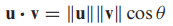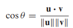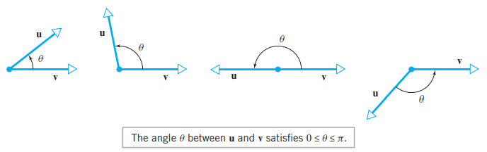 - 벡터 u, v 사이의 각(angle)은 크기가 0<= θ <= π 인 u, v에 의해 결정되는 각 θ 입니다.