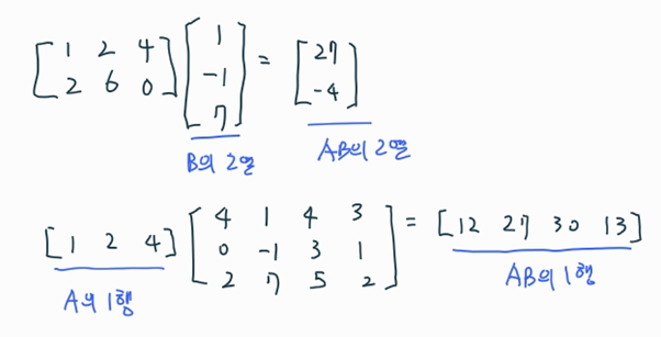 - 만약 AB 연산결과에서 2번째 열만 필요하다면 AB를 전체를 계산할 필요 없이 B의 2열만을 이용하여 계산할 수 있습니다. 마찬가지로 1번째 행만 필요하다면 AB를 전체를 계산하지말고 A의 1행만을 이용하여 계산할 수 있습니다.