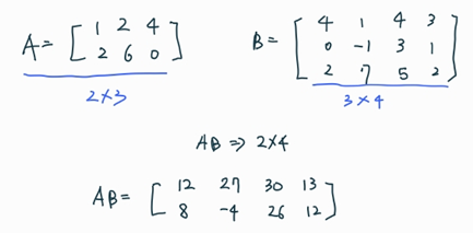 - AB의 i행 j열 값은 A의 i 행 x B의 j열 연산을 통해 값을 얻어낼 수 있습니다.