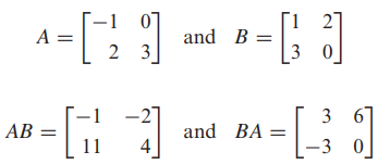 - AB와 BA가 모두 정의되고 크기도 같지만 두 행렬이 서로 다른 경우(아래 예시 참고)