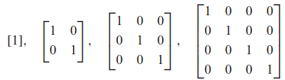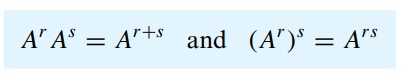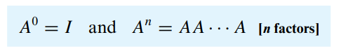 - 만약 A가 정방행렬이면 A의 음이 아닌 정수에 대한 거듭제곱은 다음과 같이 정의합니다.
