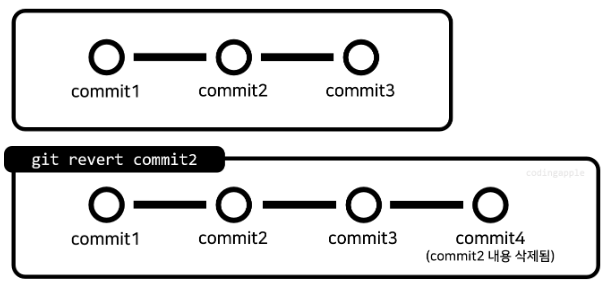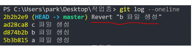 - 만약 위 커밋들 중에서 b파일 생성한 커밋을 지우고 싶다면 저 커밋 기록자체를 지우지는 못하고 취소하는 새로운 커밋을 생성하게 할 수는 있습니다.