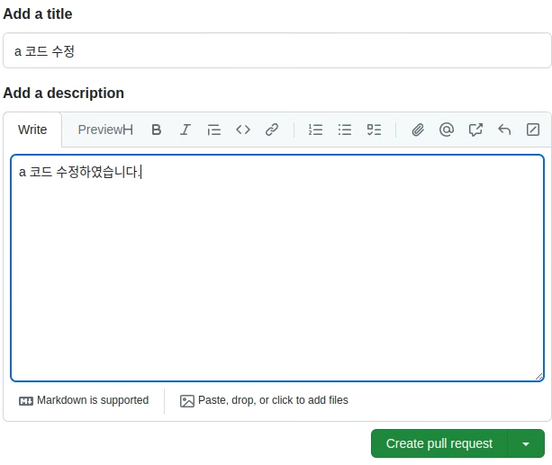 - 제목과 설명을 작성한 뒤에 Create pull request 를 요청하면 됩니다.