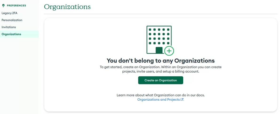 - MongoDB Atlas에서 사용자는 하나 이상의 '조직'을 만들 수 있습니다. 조직은 여러 프로젝트를 그룹화하고, 사용자들에게 다양한 프로젝트에 대한 접근을 관리하는 데 사용됩니다.
