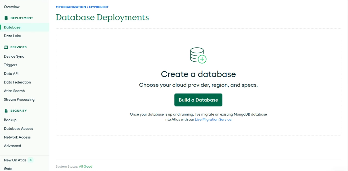 - 좌측에 Database를 클릭한 뒤, Build a Database를 진행합니다.