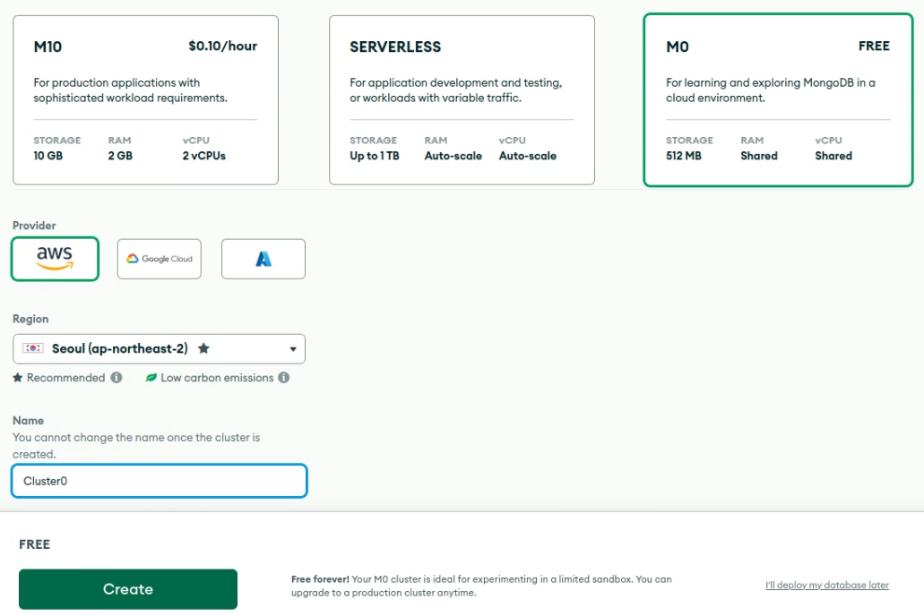 - M0 (Free 요금), AWS, Seoul, 원하는 클러스터이름 작성 후 Create클릭합니다.