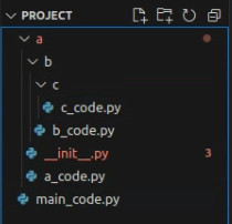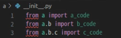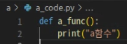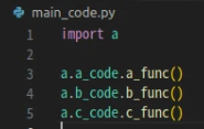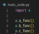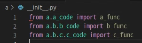 - 만약 여기서 import a만 하고 a_code, b_code, c_code 안에 있는 a_func, b_func, c_func 함수를 사용하려면 어떻게 해야 할까요? a폴더 안의 __init__.py 안에 작성된 내용에 따라 다르게 사용될 수 있습니다. 두 가지 예시를 통해 이해해 보도록 하겠습니다.