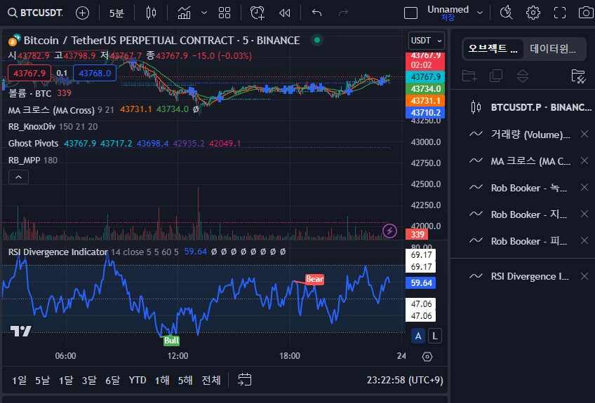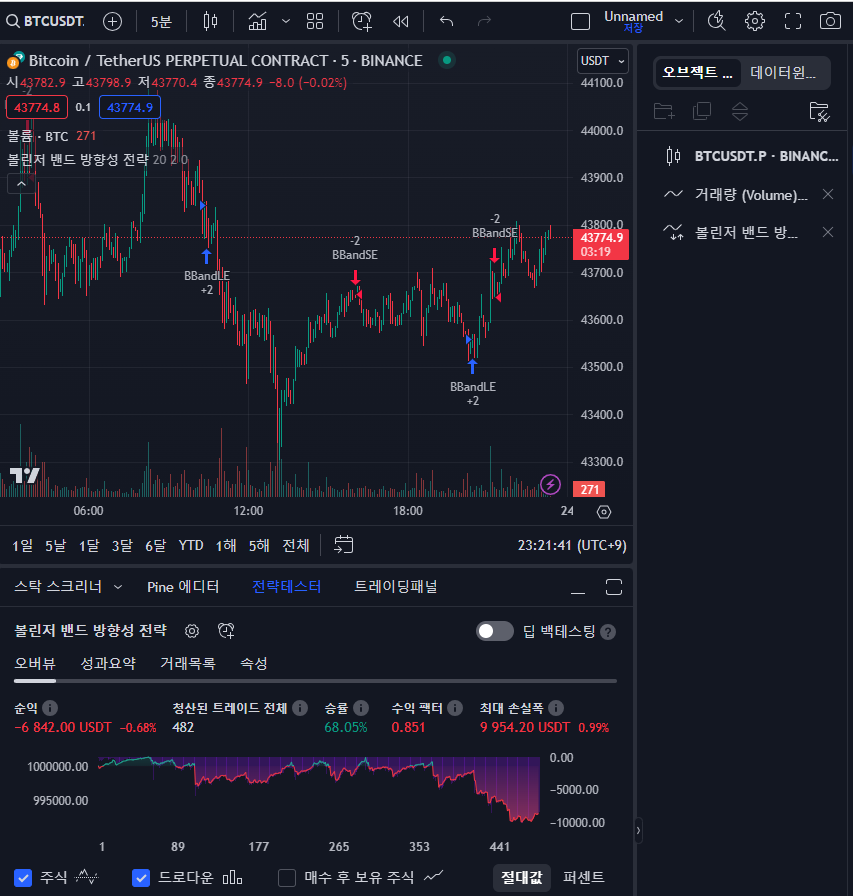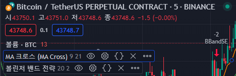 - 따라서 내가 만약 5분 봉에서 비트코인에 따른 백테스팅을 진행하고 싶다면, 차트를 비트코인 5분 봉으로 변경해 주면 됩니다.