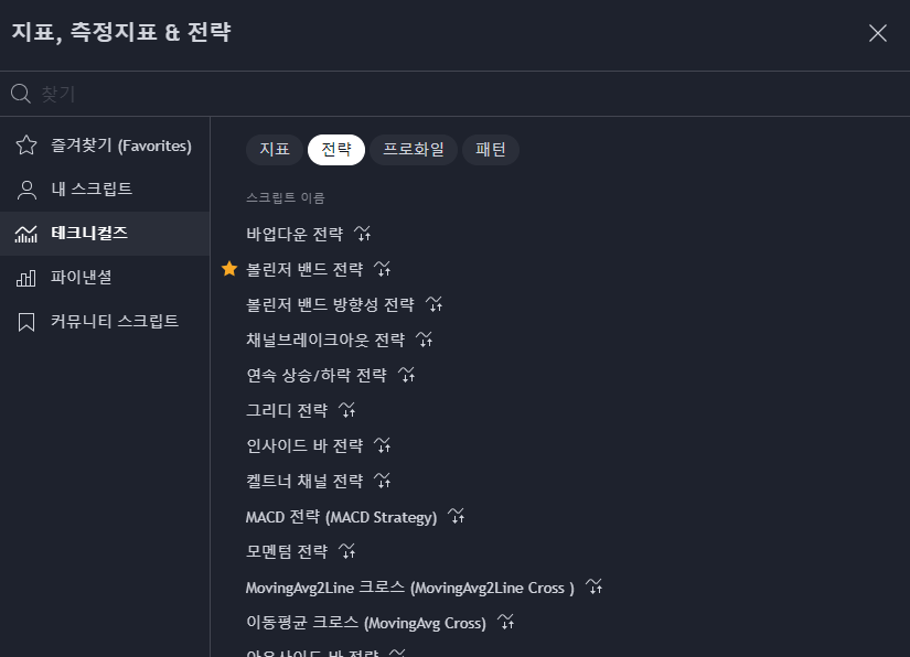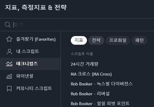 - 그 후에 이제 위에서 했던 것처럼 지표, 전략 추가에 들어가서 내 스크립트에 들어가 보면 방금 추가한 지표가 추가된 것을 확인할 수 있습니다.