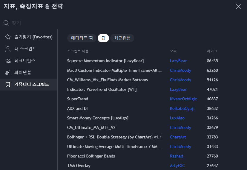 - 커뮤니티 스크립트에서 여러 사용자들이 작성한 코드들을 분석하면서 학습도 가능합니다. 다만 이 코드들은 다양한 전략들이 섞여있는 경우가 많아, 코드가 어려울 수 있습니다.