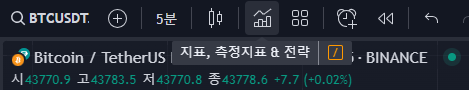 - 먼저 지표나 전략을 사용하기 위해서는 차트에서 지표, 측정지표 & 전략 클릭합니다.