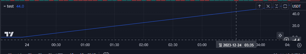 //@version=5 indicator("= test", overlay=true) start_time = input.time(timestamp("2023-12-24T00:00:00+09:00")) end_time = input.time(timestamp("2099-01-01T00:00:00+09:00")) var float v = 0 if (time >= start_time and time <= end_time) v := v+1 plot(v, color=color.blue)