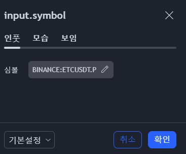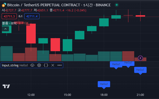 //@version=5 indicator("input", overlay=true) i_switch = input(true, "On/Off") plot(i_switch ? open : na) i_len = input(7, "Length") i_src = input(close, "Source") plot(ta.sma(i_src, i_len)) i_border = input(142.50, "Price Border") hline(i_border) bgcolor(close > i_border ? color.green : color.red) i_col = input(color.red, "Plot Color") plot(close, color=i_col) i_text = input("Hello!", "Message") l = label.new(bar_index, high, text=i_text) label.delete(l[1]) - 위와 같이 input을 설정해 두면 해당 지표/전략 설정 부분에서 값을 손쉽게 변경이 가능합니다.
